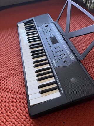 Teclado electrónico Alesis Melody 54 con 54 teclas. Incluye micrófono. - Diseño compacto y portátil. - Panel de control con botones y pantalla. - Altavoces integrados. Se vende a ese precio porque es de segunda mano, venía con el atril roto y lo hemos reparado. Se entrega con caja original.