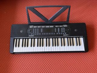 Teclado electrónico Alesis Melody61 en color negro, en buen estado y totalmente funcional. ideal para iniciarse en la música. Incluye soporte. Dispone de 61 teclas, ideal para principiantes, niños o para practicar en casa. Funciona con pilas y también tiene entrada para cable (no incluyo el cargador). Funciones: • Diferentes sonidos/instrumentos • Ritmos automáticos • Función demo • Control de volumen Teclas en buen estado y sonido correcto. Ligero y fácil de transportar. Se puede probar sin compromiso. Se vende por falta de uso.