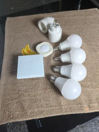 Lote inteligente Wi-Fi compatible con ALEXA y GOOGLE HOME. Control por voz y app Smart Life sin necesidad de centralita. Incluye: 4 BOMBILLAS RGB: 2 de rosca gorda (E27) y 2 de rosca pequeña (E14). Regulables. 2 ENCHUFES ANTELA (16A): Aguantan 3680W. Miden consumo y programan horarios. 3x INTERRUPTOR TÁCTIL EXTRASTAR: Diseño en cristal moderno. (2 de 2 vías y 1 de3 vias) Wifi+BLE 1 SENSOR MOVIMIENTO: Para rutinas de encendido automático. Todo en perfecto estado, testeado y listo para emparejar. Vendo por actualización de sistema a Zigbee. ¡Ideal para domotizar tu casa!