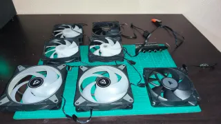 AVISO: SOLO ENVIO POR INPOST. NO SEPARO, PRECIO ESPECIAL POR SER PACK. Pack de ventiladores para PC, prácticamente nuevos, sacados de diferentes montajes de varios ordenadores mios donde he ido conservando otros. Consta de: 2 x Artic Cooling 140mm RGB, 4pines 1 x Corsair 120mm, 4 pines 2 x Mars Gaming 120mm, varían de color según voltaje recibido, 3pines 1 x Nfortec 120mm, molex 1 x Tacens 120mm, 3pines + molex REGALO controladora para gestionar ventiladores