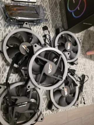 El conjunto nuevo tiene un precio de más de 110 euros, los vendo por 80 euros. EZDIY-FAB Moonlight, para ordenador. Son de 6 pines conectados a controladora con alimentación sata. Uso con mando o con conector de 3 pines 5v a placa base (control por software). Son 10 ventiladores nuevos en total, la controladora y el mando a distancia. 3 de los ventiladores, controladora y mando, son totalmente nuevos. Todo lo anterior, está perfecto y con sus embalajes. En el pack añado otro mando adicional (a reparar), otra controladora (a reparar) y 2 ventiladores adicionales (funcionales uno de ellos necesita conector faston).