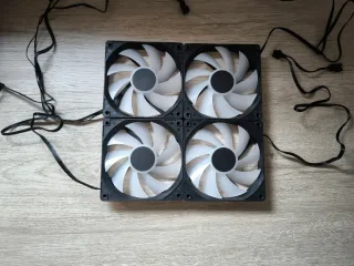 4 ventiladores RGB de 120mm para PC. Buen flujo de aire sin mucho ruido. En la tercera foto se puede ver como se ven encendidos, puede ponerse cualquier color. Cada uno tiene su propio conector PWM para controlar su velocidad y su conector ARGB para controlar sus luces en cualquier placa base con cualquier programa. Usados prácticamente 2 días porque los cambie por estética. No tienen caja porque venían en un gabinete.