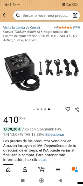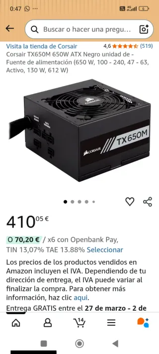 Fuente de alimentación modular Corsair TX650M de 650W. - Certificación 80 PLUS Gold. - Condensadores 100% japoneses de 105°C. - Ventilador con control termostático para bajo ruido. - Regulación de voltaje superior y fiabilidad a largo plazo. - Serie TX-M. Gamer