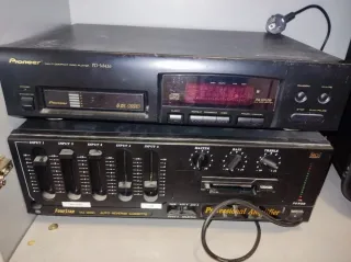 Equipo de sonido compuesto por un reproductor de CD Pioneer y un amplificador Fonestar. - Reproductor de CD Pioneer PD-M426. - Amplificador Fonestar MJ-900C con auto reverse cassette. - Múltiples entradas y controles de audio. Somos una asociación y antes de usaban para las fiestas, lo hemos probado y se oye pero no podemos especificar más