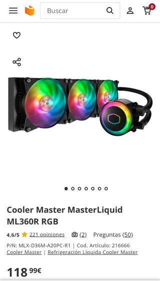 Cooler Master MasterLiquid ML360R RGBMasterLiquid ML360R RGB Peso y dimensiones Peso: 1,68 kg Dimensiones del ventilador (A x A x P): 120 x 120 x 25 mm Ancho de radiador: 39,4 cm Profundidad de radiador: 11,9 cm Altura de radiador: 2,72 cm Anchura de la bomba: 8,36 cm Largura de la bomba: 7,18 cm Altura de la bomba: 5,27 cm Control de energía Voltaje de bomba: 12 V Voltaje del ventilador: 12 V Contenido del embalaje Incluye controlador RGB: Si