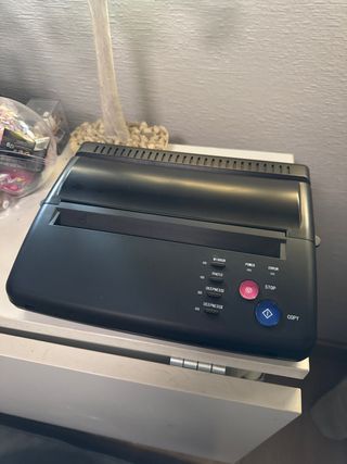 Máquina termocopiadora para transferir diseños de tatuajes. - Diseño compacto y fácil de usar. - Indicadores LED para el estado de la operación. - Botones de control para funciones como Mirror, Photo, Deepness, Power, Stop y Copy.