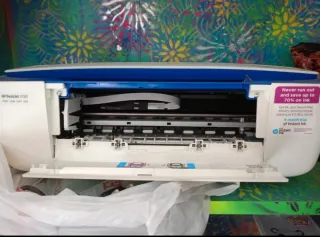 Impresora multifunción HP en buen estado. Combina un diseño moderno con funcionalidad. - Color azul y blanco. - Panel de control con pantalla. - Botón de encendido.