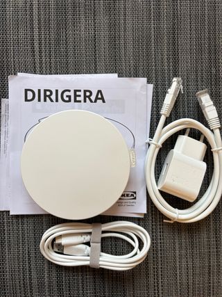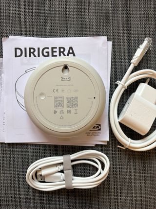 Hub DIRIGERA de IKEA para el hogar inteligente. Permite controlar dispositivos compatibles. - Incluye el hub, cable de alimentación y cable de red. - Sin estrenar