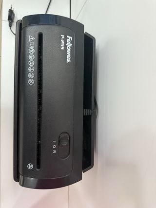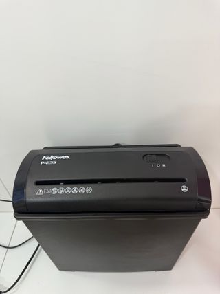 Trituradora de papel Fellowes modelo P-255. - Diseño compacto y elegante en color negro. - Indicadores luminosos para su uso. - Palanca de control para las funciones: I (Encendido), O (Apagado), R (Retroceso).