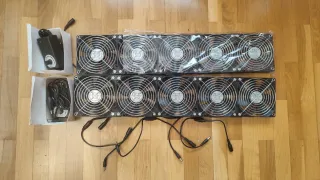 Pack de diez ventiladores de 120mm, ideales para refrigeración. Incluyen control de velocidad para ajustar el flujo de aire según tus necesidades. - Diez ventiladores de 120mm. - Control de velocidad incluido. - Nuevos y sin usar.
