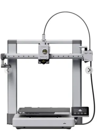 Impresora 3D de la marca Bambu Lab, modelo A1. Su diseño combina tonos grises y blancos. - Estructura robusta y moderna. - Panel de control integrado.