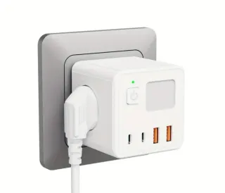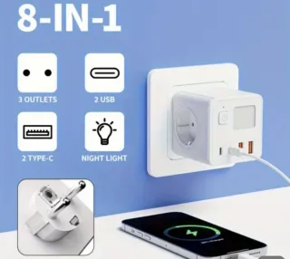 Adaptador de corriente multifunción 8 en 1, ideal para cargar varios dispositivos a la vez. Incluye una luz nocturna. Control de brillo - 3 tomas de corriente alterna (CA). - 2 puertos USB. - 2 puertos USB Tipo-C. - Función de luz nocturna.