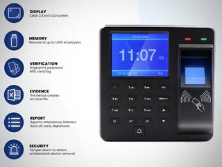 Dispositivo para el control de acceso y registro de personal mediante huella dactilar. - Teclado numérico. - Pantalla integrada. - Sensor de huella dactilar.