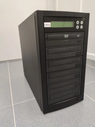 Torre duplicadora autónoma para CD/DVD con capacidad de copia 1 a 5. - Diseño compacto y elegante. - Pantalla LCD informativa. - Botones de control intuitivos.