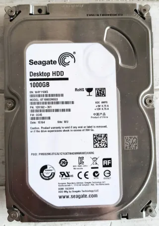 Disco duro interno de 1TB para PC. - Capacidad: 1000 GB - Interfaz: SATA - Modelo: ST1000DM003 - Voltaje: +5V 0.75 A, +12V 0.75 A - Fabricado en China - Fecha de fabricación: 10/2014