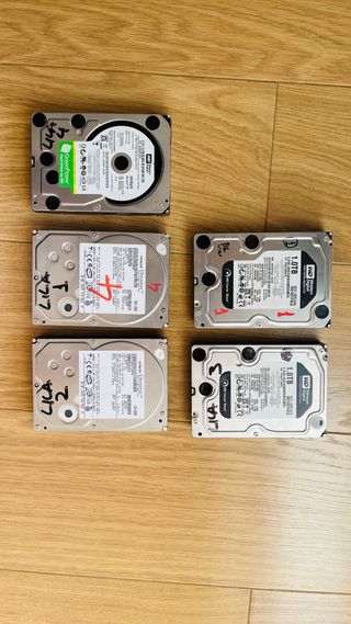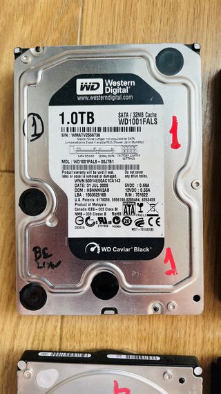 Lote de cinco discos duros de 1TB cada uno. Incluye unidades de las marcas Hitachi y Western Digital. - Capacidad: 1TB por unidad. - Marcas incluidas: Hitachi y Western Digital. - Ideales para almacenamiento adicional.