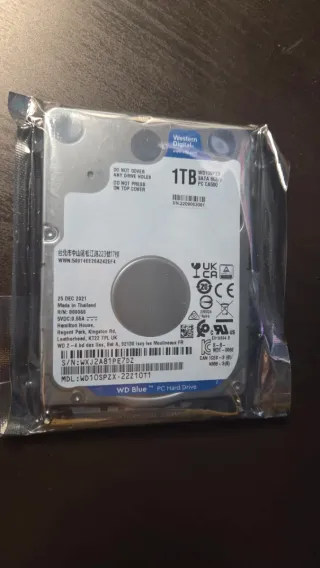Disco duro interno de 1TB en formato de 2.5 pulgadas. Esta nuevo! Usado para un backup. - Capacidad: 1TB - Interfaz: SATA 6Gb/s - Modelo: WD10SPZX-22Z10T1 - Fabricado en Tailandia - Fecha de fabricación: 25 DIC 2021