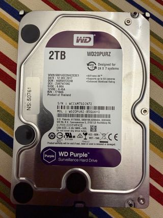 Modelo WD20PURZ 5400Rpm y 64MB Cache Conexión Sata 2TB Serie Purple vídeo vigilancia Producto usado funciona bien