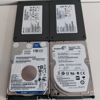 Conjunto de cuatro unidades de almacenamiento de 2.5 pulgadas con escasa horas de uso - Un HDD Western Digital 2,5"de 1TB con 658 horas de uso. - Dos SSD Micron de 128GB con 1459 y 1491 horas de uso - Un HDD Seagate 2,5" de 500GB con 4082 horas de uso. Todos en perfecto estado.