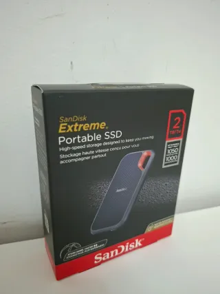 SanDisk Extreme Portable SSD con una capacidad de 2TB. Resistente al agua y a los golpes. Diseñado para un almacenamiento rápido y portátil. ● Totalmente nuevo a estrenar precintado sin abrir. ● NO Negociable, hago envios. - Capacidad: 2 TB - Velocidad de lectura: hasta 1050 MB/s - Velocidad de escritura: hasta 1000 MB/s - Diseño compacto y resistente
