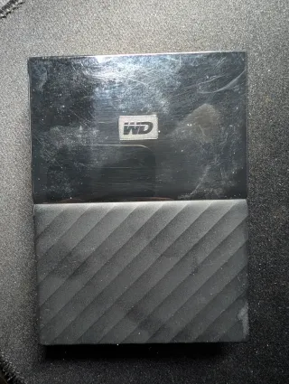 Estéticamente tiene marcas porque rozaba con un cajón. Tiene muy pocas horas de uso. Lo usaba de tercera copia de seguridad de mis proyectos. Disco duro externo de la marca WD en color negro. Presenta un diseño moderno con una parte superior brillante y otra con textura de líneas diagonales. - Parte superior brillante con logo. - Parte inferior con diseño de líneas diagonales.