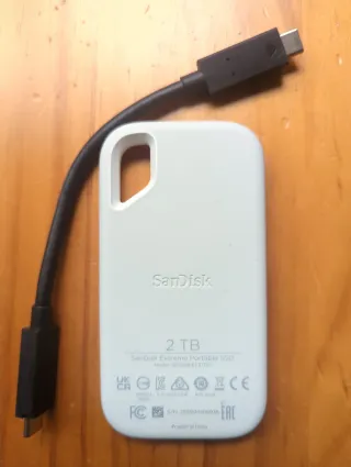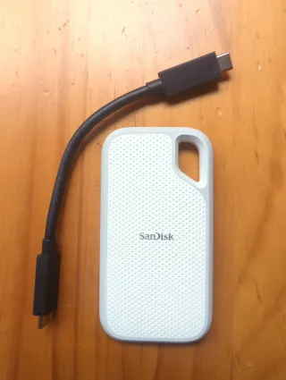 Disco duro SSD externo SanDisk Extreme Portable. - Capacidad de 1TB. - Velocidad de hasta 1050 MB/s. - Conexión NVMe y USB 3.2. - Certificación IP65. - Color blanco. - Cable USB TYPE C A USB TYPE C Lo vendo por que lo compre por error, y no lo puedo devolver ya. Esta completamente nuevo.
