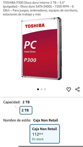 TOSHIBA P300 Disco duro interno 2 TB – 3,5" (pulgadas) – Disco duro SATA (HDD) – 7200 RPM – 6 GB/s – Para juegos, ordenadores, equipos de escritorio, estaciones de trabajo y más Capacidad de almacenamiento digital2000 GB Interfaz del disco duroSerial ATA Tecnología de conectividadSATA MarcaToshiba Función especialTemperatura máxima de 0 a 60 °C. Factor de forma del disco duro3,5 Pulgadas DISCO DURO DE GRAN RENDIMIENTO: Este disco duro ofrece una extraordinaria performance, con una velocidad de interfaz de hasta 6 GB/s (gigabits por segundo) y 7200 revoluciones (RPM) por minuto. El dispositivo ideal para los que buscan velocid...