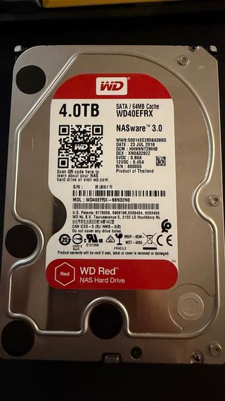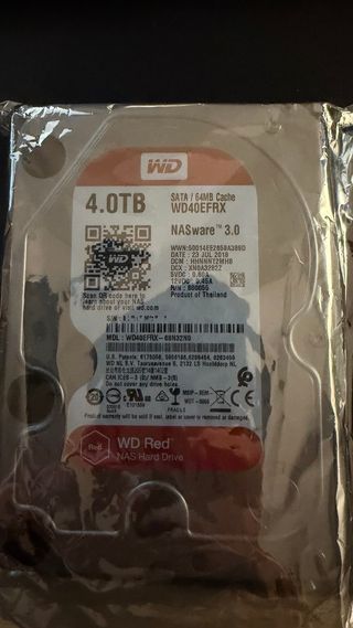 Disco duro Western Digital Red de 4TB, modelo WD40EFRX, diseñado para NAS. - Capacidad: 4TB - Caché: 64MB - Interfaz: SATA - Tecnología: NASware 3.0 - Fabricado en Tailandia