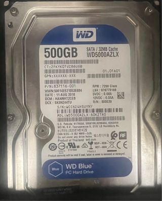 Disco duro interno de 500GB de capacidad. - Modelo: WD5000AZRX - Interfaz: SATA - Caché: 64MB - Fabricado en Tailandia