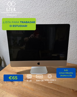 ¿Buscas un ordenador de sobremesa económico, bonito y listo para usar? Este iMac ha sido actualizado con Xubuntu 24.04.4 LTS, una versión de Linux ultra ligera que le devuelve la agilidad. Es perfecto para tareas escolares, teletrabajo básico, ver películas o navegar por internet sin complicaciones. ESPECIFICACIONES: 🧠 PROCESADOR: Intel Core 2 Duo a 3.06GHz. ⚡ MEMORIA RAM: 8GB (ideal para multitarea básica). 💾 DISCO DURO: 500GB de almacenamiento para todas tus fotos y documentos. 🖥️ PANTALLA: 21.5 pulgadas con altavoces integrados de gran calidad. ✅ SISTEMA: Xubuntu (rápido, seguro y muy fácil de usar)..