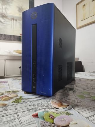 Ordenador de sobremesa HP Pavilion - Procesador AMD - 8650 3.20 GHz - 8 GB Ram - Grafica 1GB - SSD 250 GB - 500 GB disco duro - Diseño moderno con acabado texturizado. - Panel frontal con ranuras y puertos de conexión. - Logo de HP en la parte superior. - Indicación de audio y USB en el frontal.