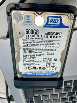 Disco duro interno Western Digital Scorpio Blue de 500 GB. - Capacidad: 500 GB - Modelo: WD5000BPVT - Interfaz: SATA - Fecha de fabricación: 25 DIC 2011 - Fabricado en Malasia