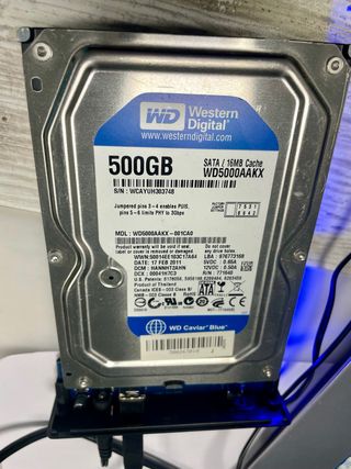 Disco duro interno de 3,5 pulgadas con capacidad de 500GB. - Modelo WD Caviar Blue. - Interfaz SATA. - Caché de 16MB. - Fecha de fabricación: FEB 2011.