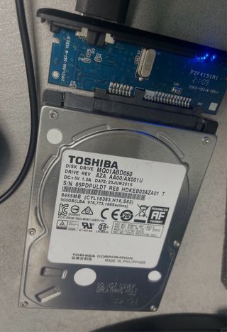 Disco duro interno Toshiba de 500 GB. - Modelo: MQ01ABD050 - Capacidad: 500 GB - Fecha de fabricación: 25 JUN 2015 - Interfaz: SATA - Fabricado en Filipinas