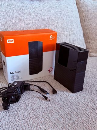 Disco duro externo de gran capacidad para almacenar todos tus archivos importantes. Incluye su caja original y todos sus accesorios. - Capacidad: 8 TB - Modelo: My Book - Color: Negro - Incluye adaptador de corriente y cable USB.