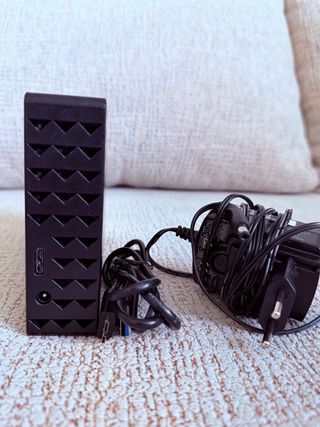 Disco duro externo de 8TB. Su diseño es elegante y moderno, con una carcasa que combina metal y cristal. - Capacidad de 8TB. - Acabado superior en negro brillante. - Laterales con rejilla para ventilación. - Incluídos cables de conexión y alimentación.