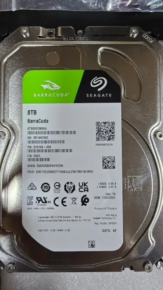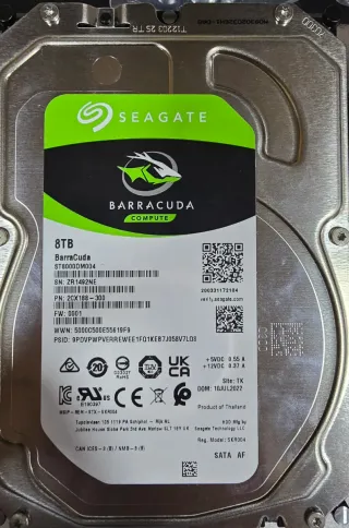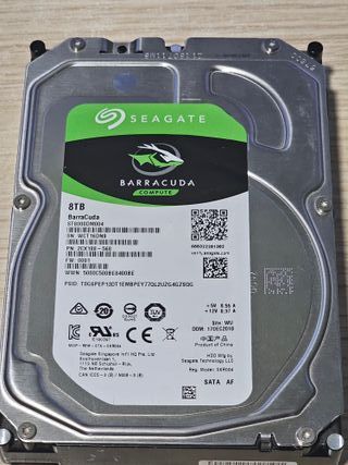 Disco duro interno de 8TB de la línea BarraCuda. - Modelo: ST8000DM004 - Capacidad: 8TB - Interfaz: SATA - Fabricado en Tailandia En muy buen estado. Lo he usado siempre como almacén de videos.
