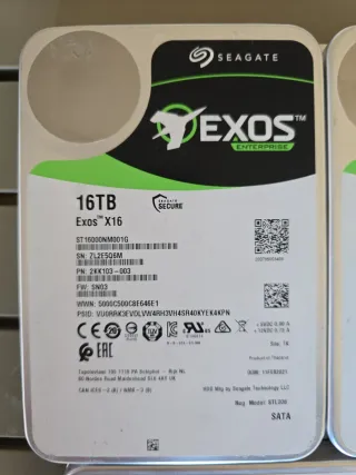Disco duro Seagate Exos X16 de 16TB. el precio es por unidad. tienen pocas horas de uso. preferible trato en mano. - Modelo: ST16000NM001G - Número de serie: ZL2E5Q6M - Número de pieza: 2KK103-003 - Firmware: SN03 - WWN: 5000C500C8E646E1 - PSID: VUORRK3EVDLVW4RH3VH4SR40KYEK4KPN - Fabricado en Tailandia - D.O.M.: 11FEB2021 - Conexión SATA