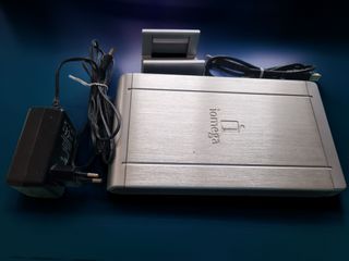 Disco duro externo Iomega de 750 GB con acabado metálico plateado. Incluye su adaptador de corriente y cable USB. - Capacidad: 750 GB - Material: Aluminio - Conexión: USB - Incluye: Adaptador de corriente, cable USB