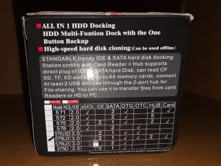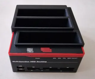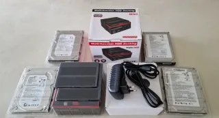 Docking station Fideco Y842 con 2 bahías, para discos duros de 2,5" y 3,5". Tiene opción de clonado (puedes clonar el disco duro de la ranura 1 en el de la ranura 2) y de conexión USB a ordenador. Se vende por no necesitar, y por cambiar a otro mas moderno. La conexión por USB da problemas al copiar muchos datos (se desconecta) pero lee bien y la opción de clonado funciona sin problemas.