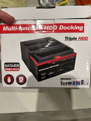 Se vende estación de acoplamiento multifunción para discos duros con capacidad para tres unidades. - Incluye 4 discos duros, de: 80, 120, 300 y 500 GB. - Compatible con SATA/IDE. - Conexión USB 3.0. - compatible con PC y portátiles. - Entrada para: 2usb y 6 tipos de tarjetas.