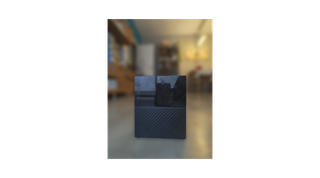 Disco duro externo de la marca WD. Su diseño es elegante y compacto. - Acabado en color negro. - Superficie con textura acanalada.