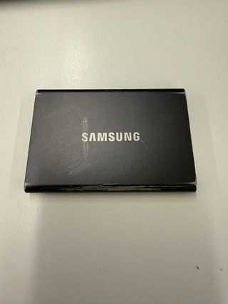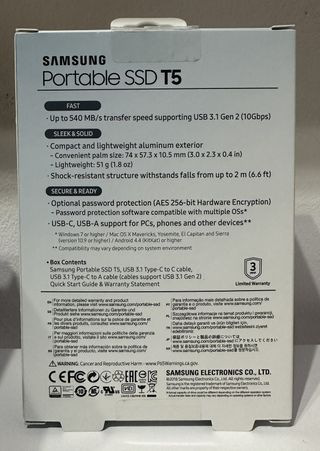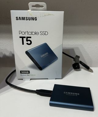 Disco Duro Externo Samsung T5 SSD 512GB NO rebajo, no intercambio. + Incluido: Caja original, guía de usuario, cable USB y tipo C + Hasta 540 MB/s de transferencia + Capacidad: 512 GB (teóricos) unos 465GB reales + Formateado en NTFS (en Windows) Ha sido probado en Windows y Mac Mini y funciona perfectamente. Adjunto captura de la app CrystalDiskInfo en el que se puede ver que está en excelente estado de salud.