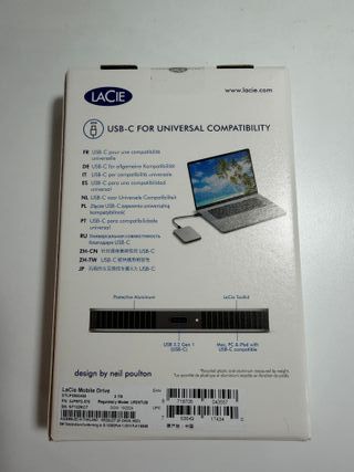 Disco duro externo portátil LaCie Mobile Drive de 2TB con conexión USB-C. Incluye servicios de recuperación de datos Rescue. Sin abrir, precintado - Capacidad: 2TB - Conexión: USB-C - Velocidad: 130MB/s - Incluye 3 años de Rescue Data Recovery Services - Producto fabricado con un mínimo de 25% de materiales reciclados.