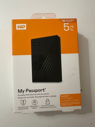 Disco duro externo portátil WD My Passport de 5TB con cifrado. Nuevo. Original. No negociabke - Capacidad: 5 TB - Interfaz: USB 3.2 Gen1 / USB 3.0 - Protección de contraseña - Garantía limitada de 3 años - Incluye software Acronis True Image for Western Digital