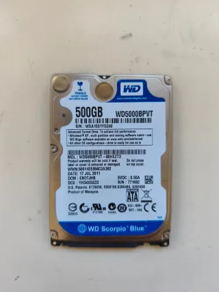 Disco duro interno Western Digital WD Scorpio Blue de 500GB, formato 2.5 pulgadas, ideal para portátiles, cajas externas o proyectos de recuperación y ampliación de almacenamiento. Modelo WD5000BPVT, interfaz SATA, funcionamiento a 5V – 0.55A. Fabricado en 2011. Disco compacto, estándar para la mayoría de ordenadores portátiles. Perfecto para sustituir disco averiado, ampliar capacidad o montar como almacenamiento secundario. 🔹 Marca: Western Digital 🔹 Modelo: WD5000BPVT 🔹 Serie: Scorpio Blue 🔹 Capacidad: 500GB 🔹 Formato: 2.5” (portátil) 🔹 Interfaz: SATA 🔹 Voltaje: 5V 0.55A 🔹 Fabricación: Julio 2011 🔹 Color: Plateado / Azu