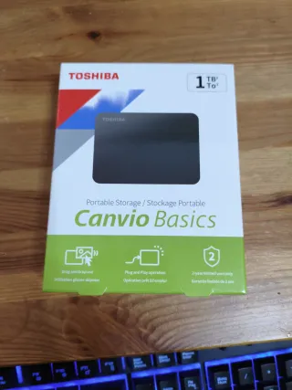 Disco duro externo portátil Toshiba Canvio Basics de 1 TB. Ideal para almacenar tus archivos y copias de seguridad. - Capacidad: 1 TB - Tipo: Almacenamiento portátil - Conexión: Plug and Play - Garantía limitada de 2 años