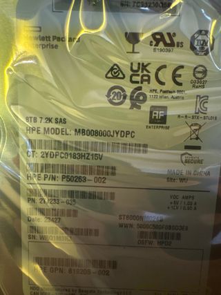 Disco duro de servidor HPE de 8TB SAS 7.2K. - Modelo: MB008000JYDPC - P/N: P50263-002 - OPN: 819205-002 - Capacidad: 8TB - Interfaz: SAS - Velocidad: 7.2K RPM