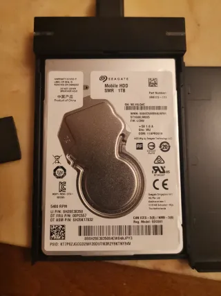 Disco duro externo portátil de 1TB de la marca Seagate. - Modelo: Mobile HDD SMR - Capacidad: 1TB - Velocidad: 5400 RPM - Número de parte: 1RK172-171 - Fecha de fabricación: 11 APR 2018