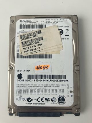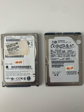 Se venden dos discos duros de 160GB, uno de la marca Hitachi y otro de Toshiba. Precio para el conjunto. - Disco duro Hitachi: Modelo HTS543216L9A300, 5400 RPM, SATA 3.0Gb/s. - Disco duro Toshiba (Fujitsu): Modelo M160S 655-1444D. - Capacidad de 160GB cada uno.